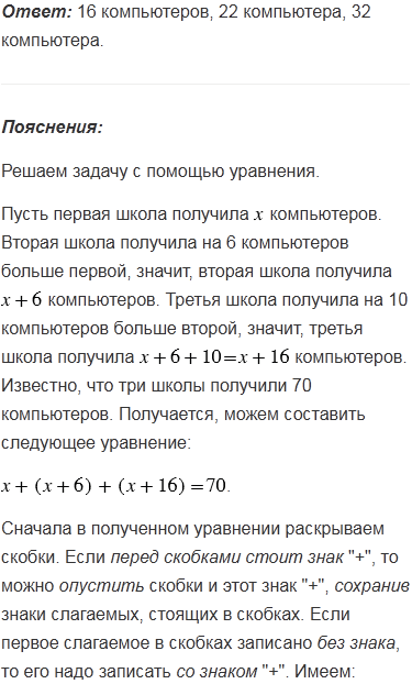 Три школы получили 70 компьютеров. Вторая школа получила на 6 компьютеров больше первой, а третья - на 10 компьютеров больше второй. Сколько компьютеров получила каждая школа?