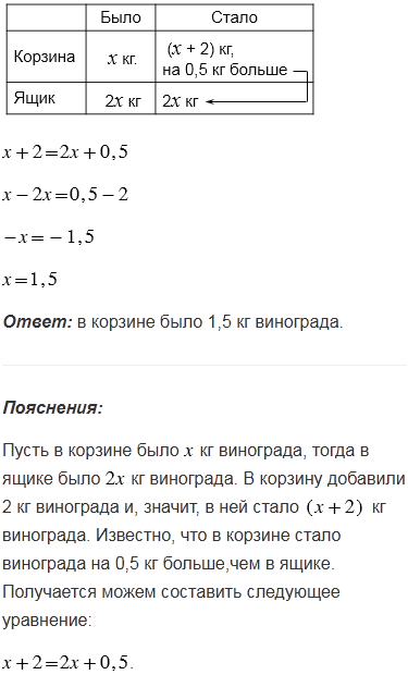 В корзине было в 2 раза меньше винограда, чем в ящике. После того как в корзину добавили 2 кг, в ней стало винограда на 0,5 кг больше,чем в ящике. Сколько винограда было в корзине?