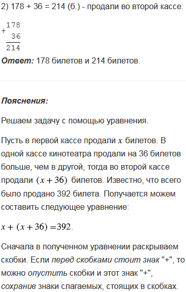 В одной кассе кинотеатра продали на 36 билетов больше, чем в другой. Сколько билетов продали в каждой кассе, если всего было продано 392 билета?