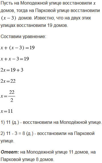 На Парковой и Молодёжной улицах восстановили разрушенные в половодье 19 домов. На Парковой было восстановлено на 3 дома меньше, чем на Молодёжной. Сколько домов было восстановлено на каждой из этих улиц?