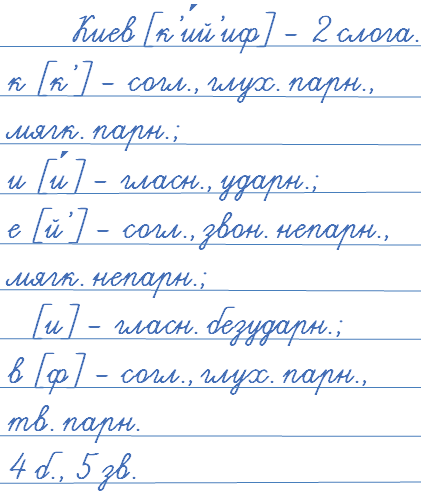 Киев [к’и́й’эф] - 2 слога, 4 буквы, 5 звуков.
