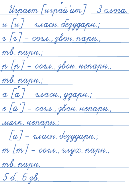 Играет [игра́й’эт] - 3 слога, 6 буквы, 7 звуков.