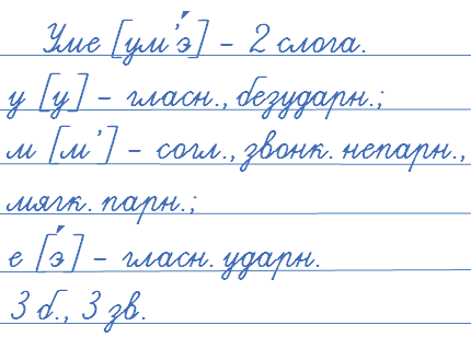 Уме [ум’э́] - 2 слога, 3 буквы, 3 звука.