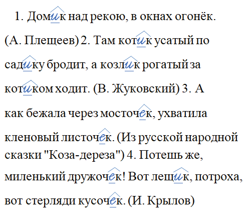 1. Дом_к над рекою, в окнах огонёк. (А. Плещеев) 2. Там кот_к усатый по сад_ку бродит, а козл_к рогатый за кот_ком ходит. (В. Жуковский) 3. А как бежала через мосточ_к, ухватила кленовый листоч_к. (Из русской народной сказки "Коза-дереза") 4. Потешь же, миленький дружоч_к! Вот лещ_к, потроха, вот стерляди кусоч_к. (И. Крылов)