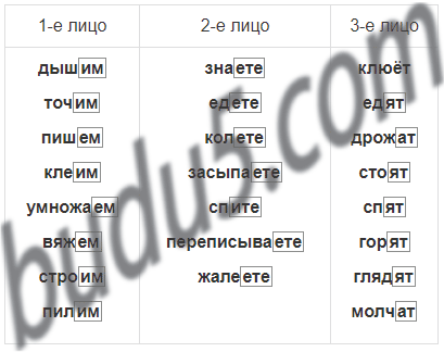 Дышим, знаете, клюёт, точим, пишем, едете, едят, дрожат, клеим, колете, стоят, умножаем, засыпаете, спят, вяжем, строим, переписываете, горят, пилим, жалеете, глядят, молчат.