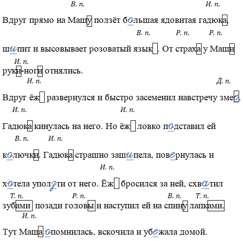 Вдруг ёж_ развернулся и быстро засеменил навстречу зме_. Гадюка кинулась на него. Но ёж_ ловко п_дставил ей к_лючки. Гадюка страшно заш_пела, пов_рнулась и х_тела упол_ти от него. Ёж_ бросился за ней, схв_тил зубами позади головы и наступил ей на спину лапками.