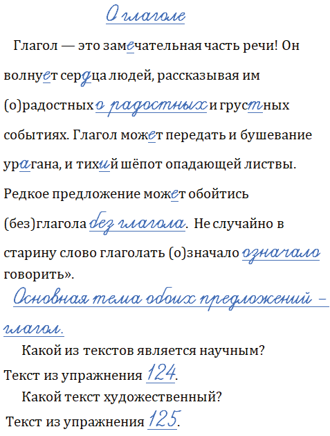 Глагол — это замечательная часть речи! Он волнует сердца людей, рассказывая им (о)радост-ных о радостных и грустных событиях. Глагол может передать и бушевание урагана, и тихйй шёпот опадающей листвы. Редкое предложение может обойтись (без)глагола без глагола. Не случайно в старину слово глаголать (о)значало означало говорить».