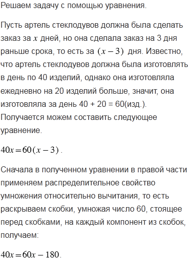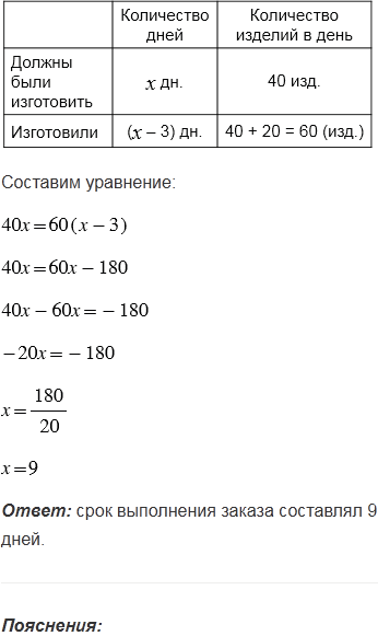 Чтобы сделать вовремя заказ, артель стеклодувов должна была изготовлять в день по 40 изделий. Однако она изготовляла ежедневно на 20 изделий больше и, благодаря этому, выполнила заказ на 3 дня раньше срока. Каков был срок выполнения заказа?