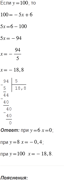 Формула \(y=-5x+6\) задает некоторую функцию При каком значении аргумента значение функции равно 6? 8? 100?