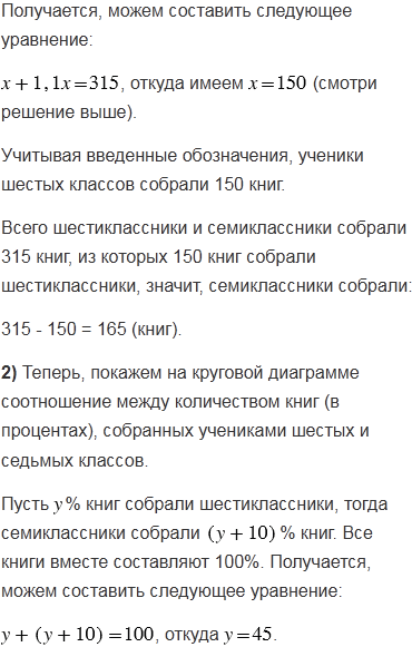 Для сельской библиотеки ученики шестых и седьмых классов собрали 315 книг. Сколько книг собрали семиклассники, если известно, что они собрали на 10% книг больше, чем шестиклассники? Покажите на круговой диаграмме соотношение между количеством книг (в процентах), собранных учениками шестых и седьмых классов.