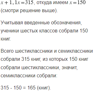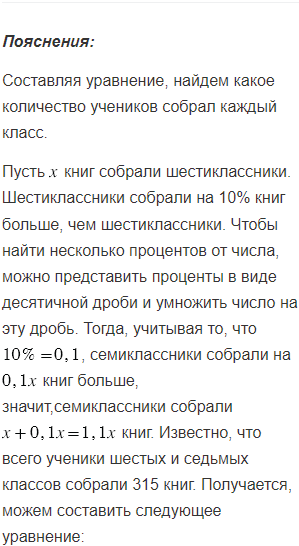 Для сельской библиотеки ученики шестых и седьмых классов собрали 315 книг. Сколько книг собрали семиклассники, если известно, что они собрали на 10% книг больше, чем шестиклассники?