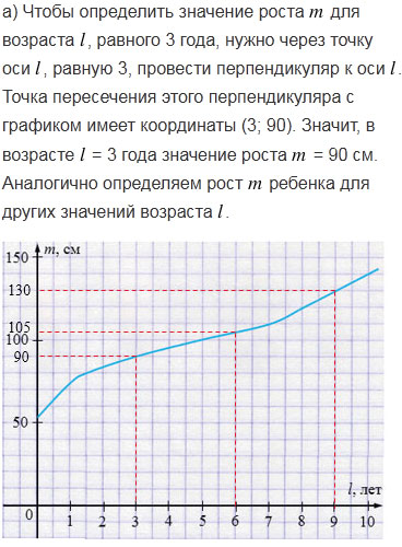 а) Чтобы определить значение роста \(m\) для возраста \(l\), равного 3 года, нужно через точку оси \(l\), равную 3, провести перпендикуляр к оси \(l\). Точка пересечения этого перпендикуляра с графиком имеет координаты (3; 93). Значит, в возрасте \(l\) = 3 года значение роста \(m\) = 93 см. Аналогично определяем рост \(m\) ребенка для других значений возраста \(l\).