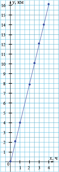 Турист вышел из города и через \(x\) ч находился на расстоянии \(y\) км от него. Зависимость \(y\) от \(x\) показана в таблице:
