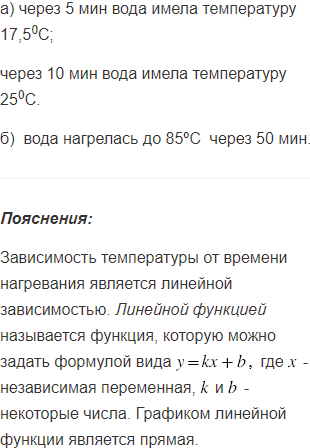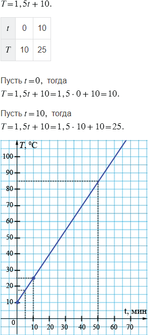 В бак налили воду, температура которой 10ºС, и нагревали её до 100ºС, причем через каждую минуту температура повышалась на 1,5ºС. Задайте формулой зависимость температуры воды Т (в градусах Цельсия) от времени нагревания t (в минутах). Постройте график этой зависимости. Узнайте по графику: