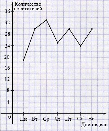 Из анализа журнала посещаемости бассейна в утреннее время с 8 до 12 часов в течение недели была получена следующая информация. В понедельник было 19 посетителей, а во вторник на 11 человек больше. В среду было на 10% больше, чем во вторник. В четверг было 25 посетителей, а пятницу на 20% больше, чем в четверг. В воскресенье число посетителей было на 6 человек больше, чем в субботу, и равнялось 30. По данному описанию постройте график зависимости числа посетителей бассейна по дням недели, соединив соседние точки отрезками.