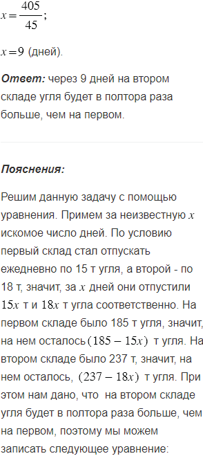 На одном складе было 185 т угля, а на другом - 237 т. Первый склад стал отпускать ежедневно по 15 т угля, а второй - по 18 т. Через сколько дней на втором складе угля будет в полтора раза больше, чем на первом?