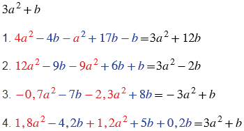 Чтобы определить, какой многочлен, тождественно равен выражению , нужно в каждом из данных многочленов привести подобные члены. Подобные слагаемые в многочлене называют подобными членами многочлена, а приведение подобных слагаемых в многочлене - приведением подобных членов многочлена. Подобные слагаемые - это слагаемые, которые имеют одинаковую буквенную часть, т.е. подобные слагаемые могут отличаться только коэффициентами (в решении подобные слагаемые выделены одинаковым цветом). Чтобы сложить (или привести) подобные слагаемые, надо сложить их коэффициенты и полученный результат умножить на общую буквенную часть.