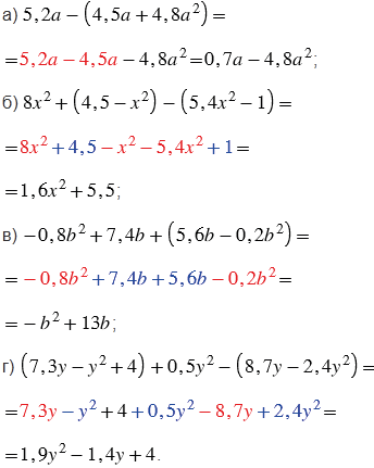 Чтобы упростить выражения, нужно раскрыть скобки и привести подобные слагаемые (в решении выделены одинаковым цветом).