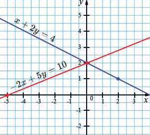б) \(\begin{cases} x + 2y = 4, \\ -2x + 5y = 10; \end{cases}\)