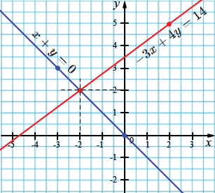 в) \( \begin{cases} x + y = 0, \\ -3x + 4y = 14; \end{cases}\)