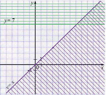 – Полуплоскость \(y\ge7\) лежит выше (или на) прямой \(y=7\), а \(y\le x\) — ниже (или на) прямой \(y=x\).