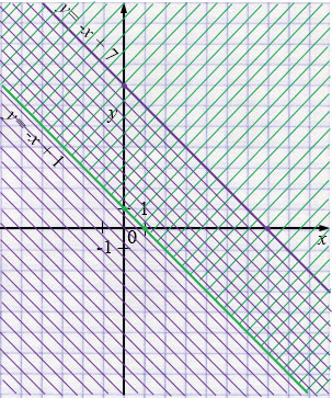 – Полуплоскость \(y \le -x + 7\) лежит ниже (или на) прямой \(y = -x + 7\), а \(y \ge -x + 1\) — выше (или на) прямой \(y = -x + 1\).