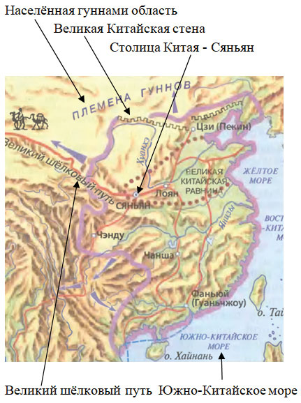 Поработайте с картой (см. с. 112). Найдите Южно-Китайское море; Великую Китайскую стену и Великий шёлковый путь; населённую гуннами область; столицу объединённого Китая. Определите название столицы.