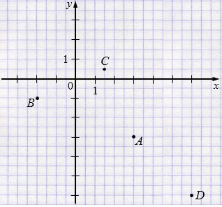 в) Абсцисса точки равна 1,5, а ордината на единицу меньше, значит, ордината равна 1,5 - 1 = 0,5. Значит, нам нужно отметить точку С(1,5; 0,5). Чтобы отметить точку с координатами (1,5; 0,5), нужно сначала пройти от начала отсчета по оси вправо на 1,5 единичных отрезка (3 клетки), а затем вверх на 0,5 единичных отрезка (1 клетку).