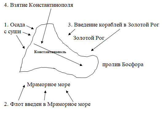 - введение кораблей во внутреннюю гавань Константинополя - Золотой Рог, чтобы осадить город с северной, слабо защищенной стороны;