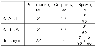 Из пункта A в пункт B автобус ехал со скоростью 90 км/ч. На обратном пути из-за непогоды он снизил скорость до 60 км/ч. Какова средняя скорость автобуса на всём пути следования?