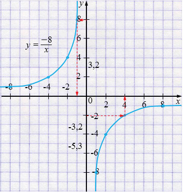 Постройте график функции, заданной формулой \(y=\dfrac{-8}{x}\). Найдите по графику: