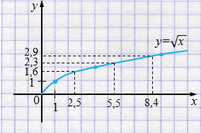 а) значение \(\sqrt{x}\) при \(x = 2{,}5;\;5{,}5;\;8{,}4\);