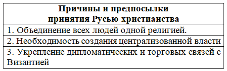 1. Найдите в учебнике описание обстоятельств восшествия князя Владимира на престол. О чём они говорят? 2. От кого при Владимире исходила главная внешняя опасность для Руси? Что он предпринял для её снижения? 3. Заполните (в тетради) таблицу с указанием причин и предпосылок принятия Русью христианства. 4. Какие события непосредственно предшествовали принятию Русью христианства? 5. Как принятие христианства повлияло на личность князя Владимира? 6. Выясните значение принятия Русью христианства. Ответ проиллюстрируйте примерами.