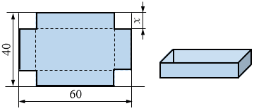 Пусть \(x\) см — сторона квадрата, тогда основание коробки имеет размеры \((60-2x)\) см и \((40-2x)\) (см). Площадь основания коробки равна \(800\) см2.