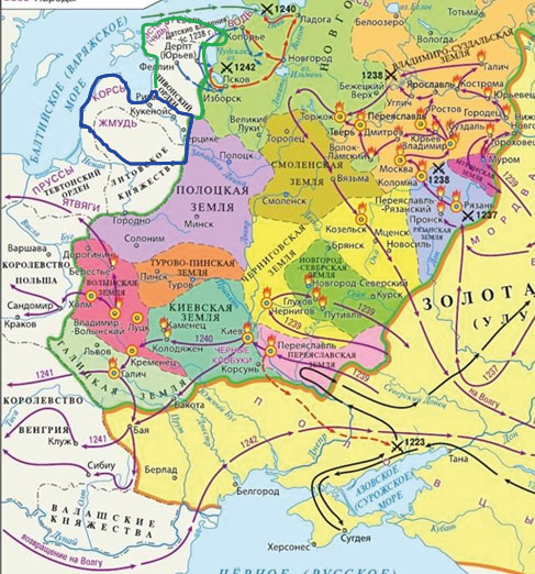 Места важнейших сражений обозначены пересечёнными черными мечами (1240 г. - Невская битва, 1242 г. - Ледовое побоище).