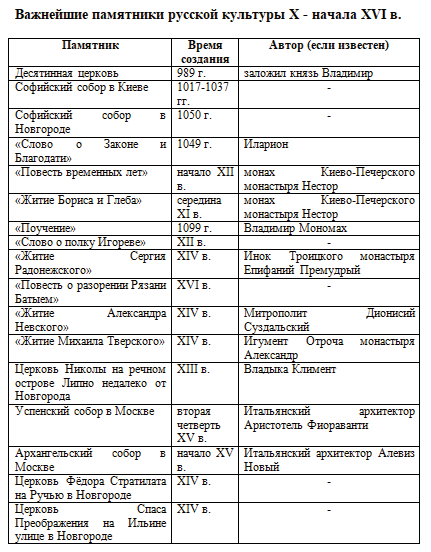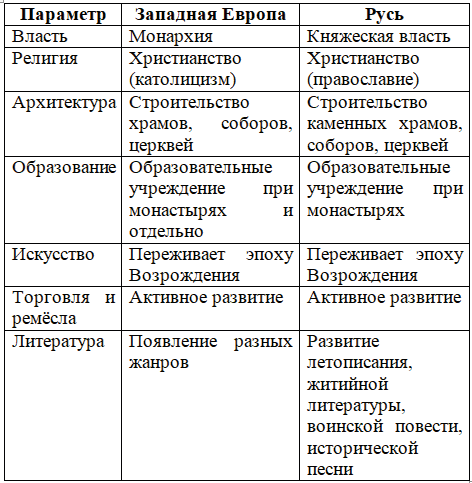1. Составьте в тетради сравнительную таблицу. Покажите в ней общие явления в развитии культуры стран Западной Европы и Руси в XIII - XIV вв. 2. Продолжите заполнение в тетради таблицы "Важнейшие памятники русской культуры X - начала XVI в.".