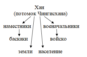 Во главе Золотой Орды стоял хан. Этот титул носили только потомки Чингисхана. Хану принадлежали все земли и население. Его власть опиралась на огромное войско и многочисленных чиновников. Для управления провинциями хан назначал наместников, которые следили за порядком и сбором налогов. Налоги собирали баскаки.