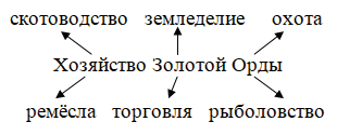 Особенности хозяйства Золотой Орды: скотоводство, земледелие, охота, рыболовство, ремёсла (кузнечное дело, изготовление изделий из металла, гончарное дело, ювелирное искусство, кожевенное, ткацкое, портняжное дело, обработка дерева, производство стеклянных, костяных и других изделий), торговля.