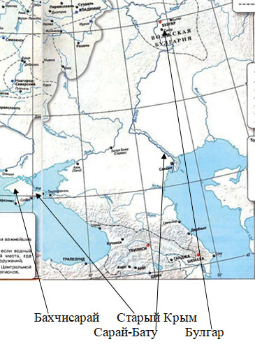 Крупнейшие города Золотой Орды: Сарай-Бату, Сарай-Берке, Бахчисарай, Булгар, Крым.