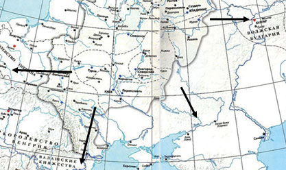 Направления торговли Руси с другими странами (слева на право): Литва; Византия; Персия, Кавказ; Средняя Азия, Золотая Орда.