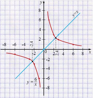 а) Чтобы решить уравнение \( \frac{6}{x}=x \), нужно найти точки пересечения двух графиков: