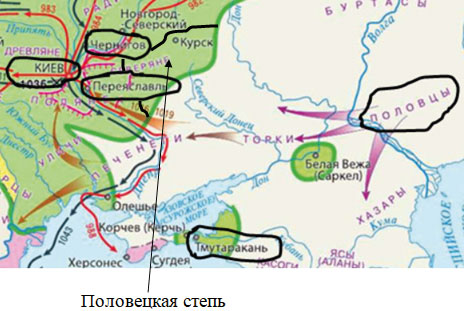1. Найдите на карте территорию Киевской, Черниговской, Переяславской, Тмутараканской земель; половецкую степь. 2. Покажите на карте место первого крупного столкновения русских и половецких войск.