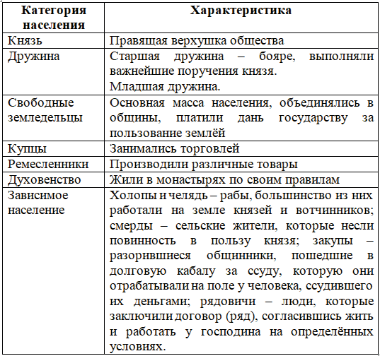 1. Правящую верхушку общества составляли киевские князья. Князья опирались на дружину. Дружина делилась на старшую - бояр, которые выполняли важнейшие поручения князя, и младшую (отроки и гриди).