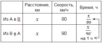 Из города \(A\) в город \(B\) автомобиль ехал со скоростью \(80\) км/ч, а обратно — со скоростью \(90\) км/ч. При этом путь из города \(B\) в город \(A\) занял на \(1\) ч меньше, чем путь из города \(A\) в город \(B\). Найдите расстояние между городами \(A\) и \(B\).
