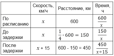 На перегоне в 600 км после прохождения \(\frac{1}{4}\) пути поезд был задержан на 1 ч 30 мин. Чтобы прийти на конечную станцию вовремя, машинист увеличил скорость поезда на 15 км/ч. Сколько времени поезд был в пути?