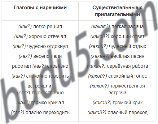 Лёгкая задача, легко решил, хорошо отвечал, хороший ответ, чудесный отдых, чудесно отдохнул, весело пели, весёлая песня, серьёзная работа, работал серьёзно, спокойный голос, спокойно говорить, торжественная встреча, встречали торжественно, громкий крик, громко кричал, опасный переход, опасно переходить.