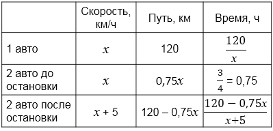Из города \(A\) в город \(B\), расстояние между которыми 120 км, вышли одновременно два автомобиля. Первый из них ехал всё время с постоянной скоростью. Второй автомобиль первые \(\frac{3}{4}\) ч ехал с той же скоростью, затем сделал остановку на 15 мин, после этого увеличил скорость на 5 км/ч и прибыл в город \(B\) вместе с первым автомобилем. Найдите скорость первого автомобиля.