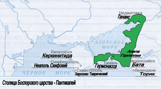 Задание 1. Обведите границы и закрасьте зелёным цветом территорию Боспорского царства. Подпишите название его столицы. Подпишите древние названия городов, обозначенных на карте.