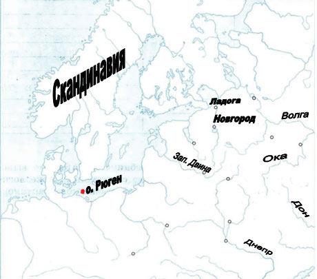 Задание 4. На контурной карте отметьте Скандинавию, остров Рюген, Ладогу, Новгород. Напишите названия крупнейших рек.