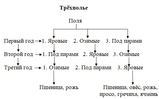6. На основе информации из учебника и дополнительной литературы нарисуйте схему трёхполья. Подпишите на схеме, какие сельскохозяйственные культуры могли выращивать восточные славяне и их соседи на каждом из участков полей.